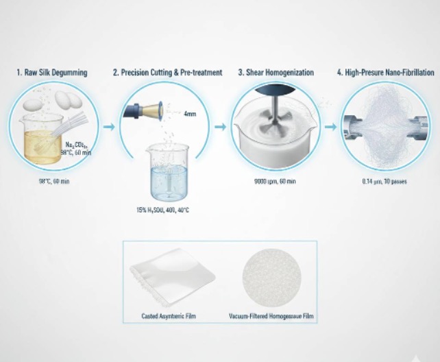 蠶絲蛋白(Silk Fibroin)於再生醫學與組織工程領域之應用,具優異的生物相容性與結構強度。最新的研究顯示,透過物理剝離技術,可製備出保留天然β片層結構的微纖維化絲蛋白(Microfibrillated Silk, MFS)。本製程關鍵在於透過高階設備進行製備,可結合本公司代理產品 Frits...